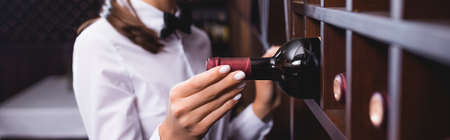Horizontal crop of sommelier taking bottle of wine from wooden rack