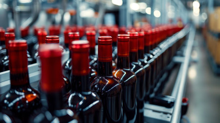 Dark wine bottles with silver caps on an automated conveyor belt inside a modern wine production factory, showcasing the bottling process and industrial efficiency.
