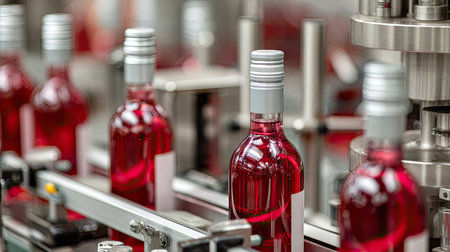 A close-up of rose wine bottles on a modern production line showcases the efficient process of filling and packaging at a winery facility.