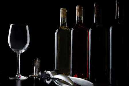 Several bottles of red, rose and white wine in a row, next to an empty glass and a corkscrew on the table.