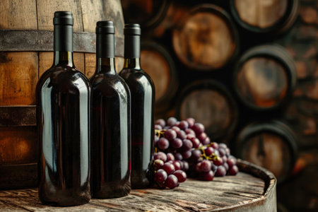 This striking still life features three elegant wine bottles artfully arranged among fresh grapes and green leaves, evoking a sense of luxury and indulgence.