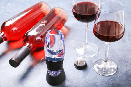 Wine aerator with bottles and glasses on color background