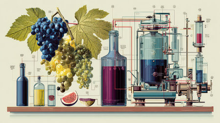 This artistic image showcases the intricate process of grape processing for wine production, highlighting equipment, bottles, and grapes. It's both informative and visually captivating.