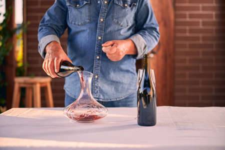 Cropped photo of a man in a denim shirt holding a bottle while pouring red wine into a glass decanter