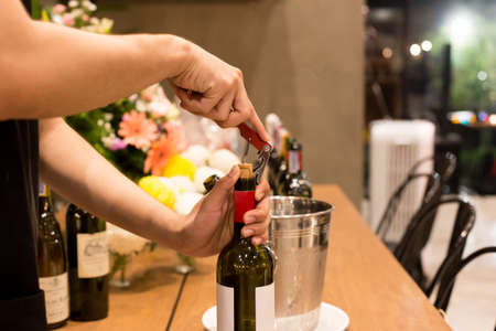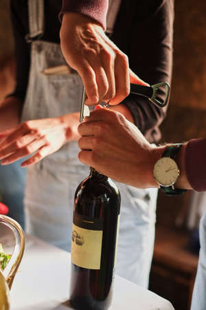 SAINT PETERSBURG, RUSSIAN FEDERATION - AUG 16 2018: man uncorks a bottles of wine. Prepares wine for sommeliers training.