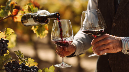 A winemaker pours rich red wine into a glass for tasting, surrounded by lush vineyard under the warm afternoon sun.
