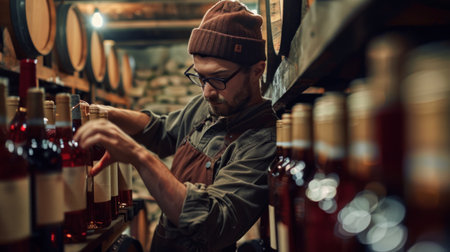 The culture of winemaking. Samelie offers wine, the hands of a winemaker with a glass of wine and an uncorked bottle, winemaking, a culture of drinking alcohol, and a distillery.