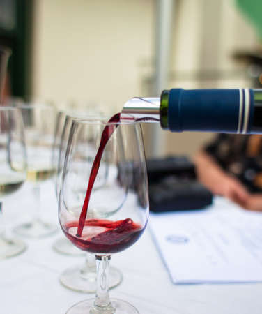 Pouring red wine at a wine tasting