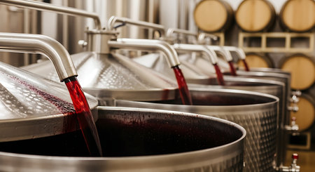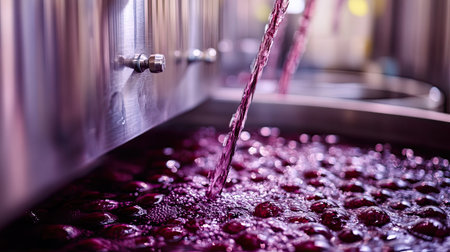 A close-up view of red liquid flowing from a metal tap into a fermentation container, showcasing the vibrant color and bubbles in the production process.
