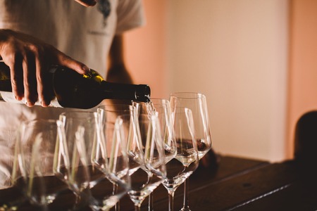 Bartender pours white wine in glasses on wooden bar counter. vineyard place with tasting.