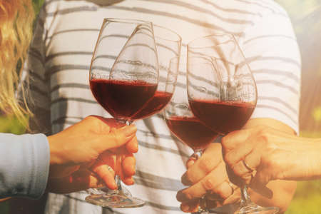 Family of different ages people cheerfully celebrate outdoors with glasses of red wine, proclaim toast People having dinner in a home garden in summer sunlight.
