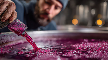 A skilled artisan pours a vibrant pink liquid into a large fermentation vat, showcasing the creative process of beverage production in a close-up shot.