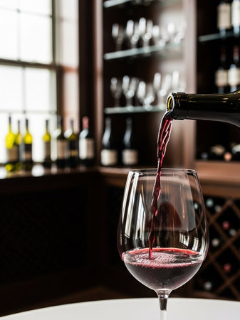 Pouring red wine in a glass, celebration of a moment with a glass of wine, exquisite liquor for gourmets, winery