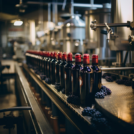 A close-up view of red wine bottles on a production line, showcasing their rich color and elegant design in a modern industrial setting.