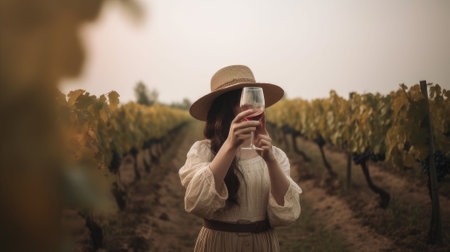 woman drinking red wine at vineyard. harvest season. Generative AI.