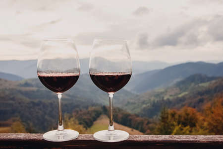 Glass of red wine against the backdrop of a vineyard at sunset in the highlands
