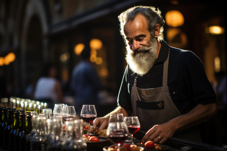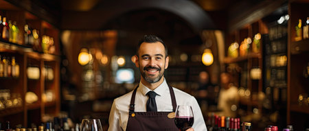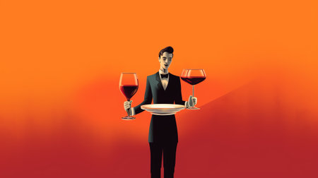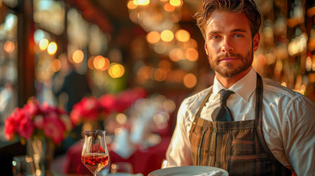 Friendly waiter holds wine glass, ready to serve at a warmly lit outdoor cafe evening setup. A.I.