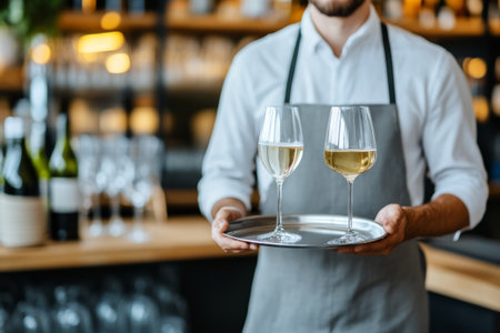 Waiter holding a tray with two glasses of white wine in a modern restaurant setting