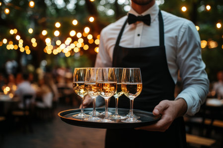 Waiter in a bow tie carrying a tray with glasses of wine at an outdoor event