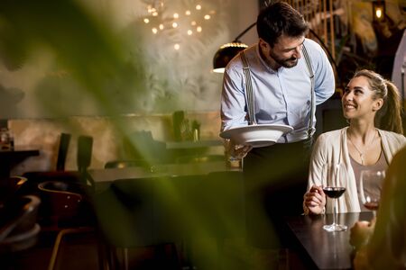 Romantic partners talking restaurant at night. Waiter serving multiracial couple at fancy hotel bar. Two millennials wait food meal on expensive dinner date. Young people go out in pub. Dating concept