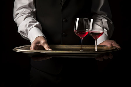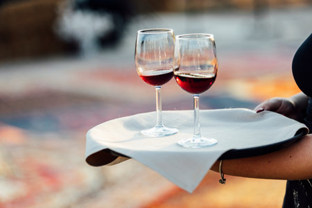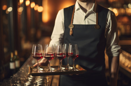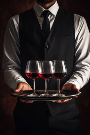 Waiter is carring plate with red Wine glasses. glasses. Wine glasses.