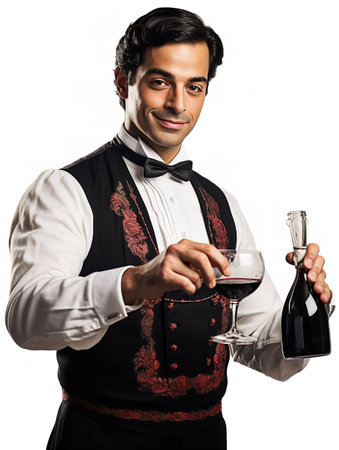 Waiter carrying a tray with wine isolated on white background
