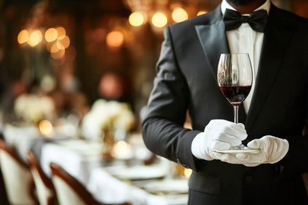 A waiter in a tuxedo holds a red wine glass while inspecting it closely at a classy restaurant during a dinner service. The atmosphere is warm and inviting.