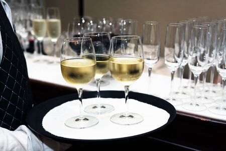 Cocktail party. Waiter holding platter with cold white wine