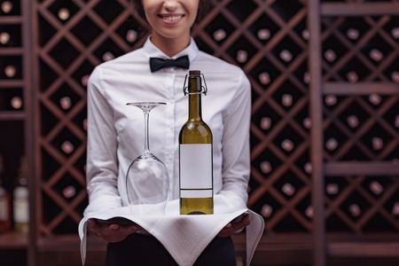 Waiter in tuxedo holding a bottel of white wine with custom etiquette