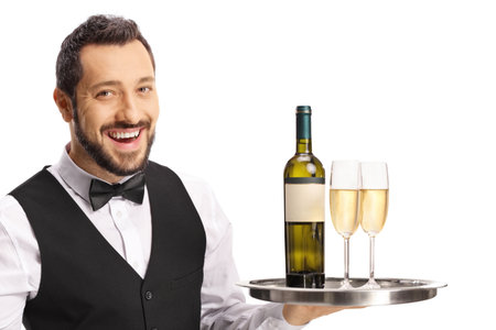 A waiter / butler in white shirt and black suit vest carrying an silver tray with a bottle of champagne and two glasses. White background.