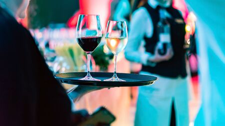 Waitress or waitress serving glasses with wine in bistro on a tray