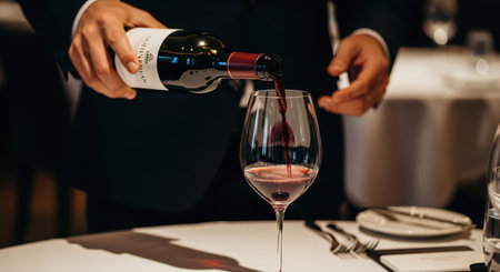 Male sommelier serving red wine at upscale restaurant dinner table