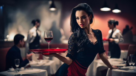 Waiter serving clients with a glass of red wine before dinner, recommending a special drink for customer satisfaction. Employee carrying a tray and serves people with professionalism. Camera B.