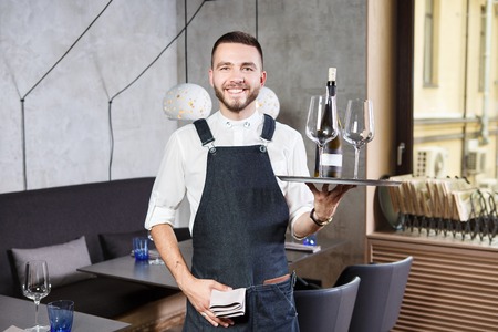 A young, handsome Caucasian waiter stands in the interior of the restaurant with a tray in his hand, two glasses and a roll of wine. Dressed in a uniform apron and shirt. Service Topic.