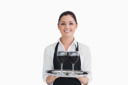 Waitress holding wine glasses on a silver tray
