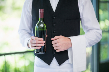 Mid section of waitress holding a bottle of red wine and a towel in restaurant