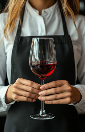 A middle-aged woman in a black apron tasting red wine at a bar restaurant