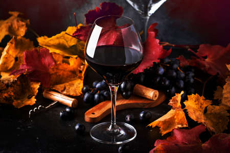Dry Red wine in wine glass, fall still life with red and yellow leaves, wine degustation, rustic style, selective focus