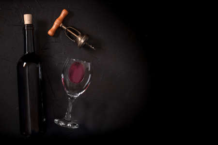 Wine tasting, top shot on a black background, with a cork, corkscrew, and a bottle, with a place for text
