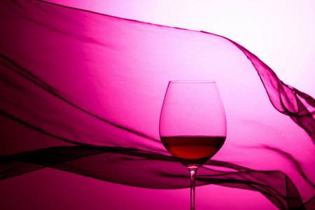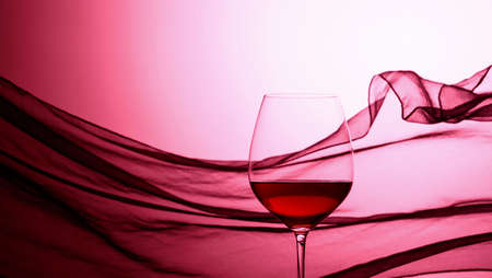 Glass of red wine on a background of waving satin curtain. Purple backlit.