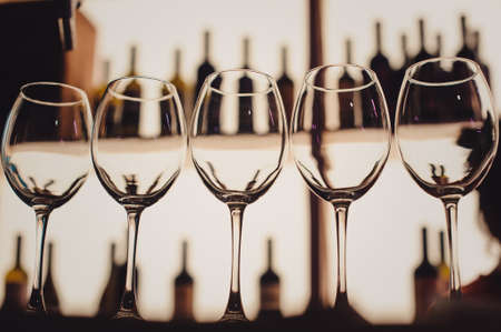 Empty wine glasses on counter table with blur wine, liquor and spirits in background.