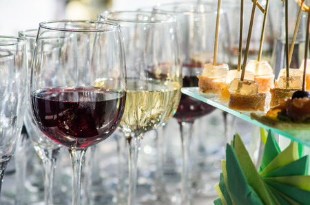 Wine glasses in a row. Buffet table celebration of wine tasting. Nightlife, celebration and entertainment concept. Vertical, cold toned image, bright lights bokeh background