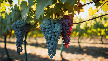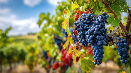 A picturesque view of a vineyard featuring clusters of ripe blue and red grapes under a sunny sky, showcasing nature's bounty and beauty.