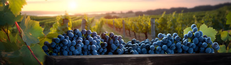 Blue vine grapes harvested in a wooden box with vineyard and sunshine in the background. Natural organic fruit abundance. Agriculture, healthy and natural food concept. Horizontal composition, banner.