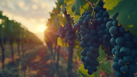 An exquisite photo ideal for use in travel guides, culinary publications, or wall art for wine enthusiasts | This image showcases a serene vineyard at sunset, with a close-up of plump grape clusters in the foreground, invoking thoughts of fine winemaking and the agricultural beauty of vineyards. The sun's warm glow, filtering through the leaves and ripe grapes, creates an almost ethereal backdrop, emphasizing the lushness of the vines and the richness of the grape's colors, ranging from deep blues to subtle purples. This tranquil scene perfectly captures the romance and tradition associated with viticulture and winemaking. The bokeh effect blurs the vines in the distance, allowing the viewer to focus on the grapes' detailed texture and their connection to the earth. The soft lighting conditions enhance the natural vibrancy of the grape skins and add a sense of depth to the foliage. The overall composition symbolizes the harmonious relationship between nature and nurture, the patience required in growing and harvesting, and the onset of the harvest season | This compelling image serves a dual purpose; it not only celebrates the picturesque beauty of the wine country but also acts as an emblem of the time-honored process that gives rise to some of the world's finest wines. It would complement editorial content exploring agritourism, the art of winemaking, or pieces focused on the experience of rural tranquility. In a more commercial light, it's a fitting promotion for vineyard tours, wine tasting sessions, and connoisseur events, as well as an authentic representation of terroir in marketing for wineries and wines | a beautifully composed photograph of a vineyard at sunset with a detailed capture of grape clusters and an inviting backdrop that promotes the allure of wine crafting and vineyard culture under a natural, golden hour ambiance, offering space for text and design elements