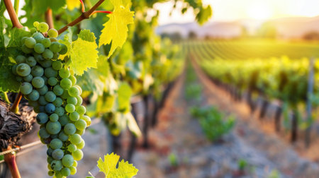 Sunny vines heavy with ripe green grapes stretch down the row in a picturesque vineyard, showcasing the beauty of harvest season. The warm light highlights the lush leaves and fertile soil.