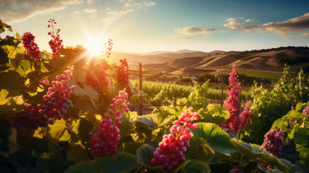 ripe grapes on the vine, bathed in sunlight, with the backdrop of a lush vineyard stretching into the distance. Generative AI