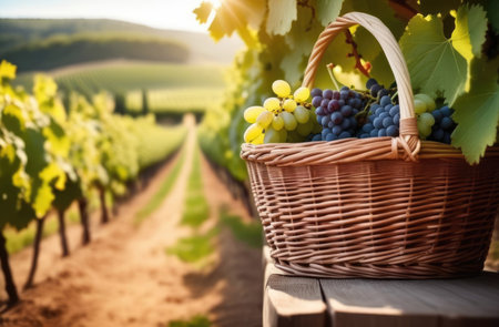 A woven basket filled with freshly harvested grapes rests among lush vineyard rows, basking in the warm glow of the afternoon sunlight, showcasing rural beauty.