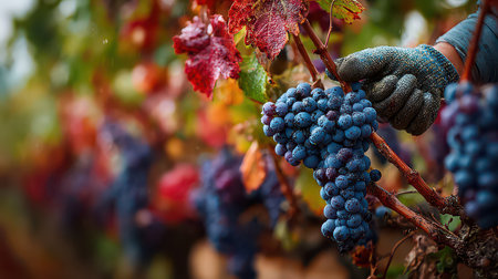 A farmer harvesting ripe blue grapes in a vibrant vineyard surrounded by colorful autumn leaves. The scene captures the essence of seasonal agriculture.