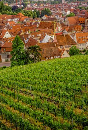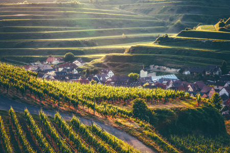 Amazing countryside landscape with a historic village, traditional houses and vineyards on terraces. Scenic view of Kaisersuhl, Germany, Black Forest. Beautiful summer travel and wine-making background. Vintage effect.